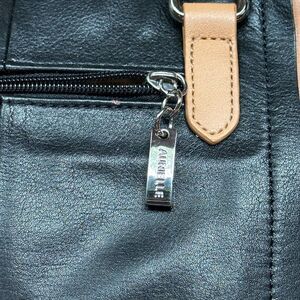 Aurielle two-tone black and tan leather handbag with manmade trim has three interior compartments, two with magnetic snap closures and one zippered. Exterior has a zippered compartment and silver-tone metal logo embellishment. Zipper tags are silver-tone metal logo. Bag measures about 13" x 8 1/2" x 5". Drop from top of straps to top of bag is about 5". Bag is pre-owned and in good condition. Has no rips or tears, but does have some minor spots on back side. See pictures.