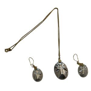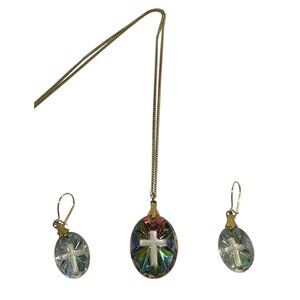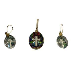Aurora Borealis Cross Pendant Necklace Earring Set Christian Catholic Religious