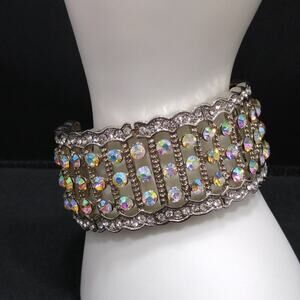 This is a beautiful wide aurora borealis rhinestone cuff bracelet which stretches on metal wire which allows the bracelet to be 6 1/2 Inches and open on the side for an easy on and off. The bracelet is pre-loved but looks new. It would be a wonderful bracelet to add bling to any outfit. All of the aurora borealis rhinestones are in place and there are three rows within the width of the band. There are tiny pave clear rhinestones along each edge. The bracelet is 1 1/4 Inches wide. It would look gorgeous for a wedding or any special occasion.