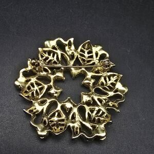 This vintage brooch features a 2" D gold tone floral wrath design with aurora borealis rhinestones