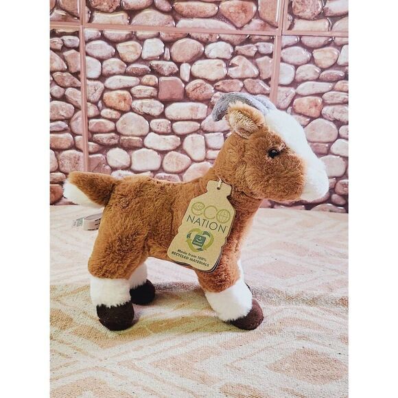 Embrace sustainability and cuteness with this Eco Nation plush toy! Crafted from recycled materials and fabric made from plastic bottles, this charming Goat captures the character of a real farmyard favorite. With its rich brown coat, distinctive white markings, and soft, curved horns, it’s not only a cuddly companion but also an advocate for a greener world.