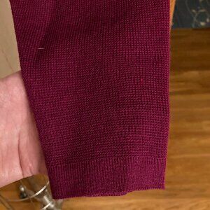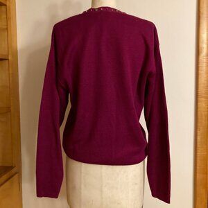 Gorgeous! Aurora One Sequin V-Neck Sweater in dark maroon or plum or wine color. Sequins are sewn in around the v-neck with alternating clear and grayish brown squares. Wool and rayon blend. Superb condition!