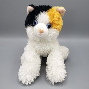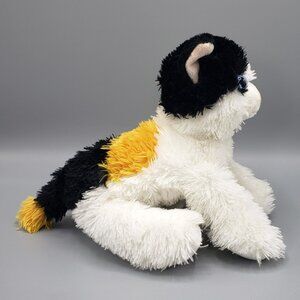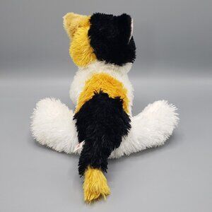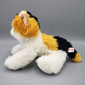 This plush kitty cat features a calico cat with a body that's mostly white, with some black and orange patches of stringy fur. The toy is a floppy kitten made by Aurora World in 2018. Containing polyester fibers and plastic pellets, this stuffed animal has a hard pink nose and plastic blue eyes. It measures approximately 12" long from nose to tip of tail.