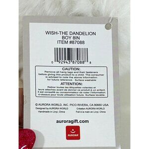 Aurora World Wish - The Dandelion Boy “ Mia” Flower Plush Stuffed Toy, unisex kids, 3+, handmade in China, has tag, September 2022, #87088. Collectible, soft, cuddly, texture, high-quality, small-sized, 8” tall, 5” wide, 2.75” deep. White, soft, furry head. Black plastic round eyes and embroidered eyebrows and lips. Soft plush.arms & body, 2 felt leaves at chest. Surface washable, all new materials, polyester fibers, handmade in. Linyi, China, Lovingly preowned, never used, has tag.