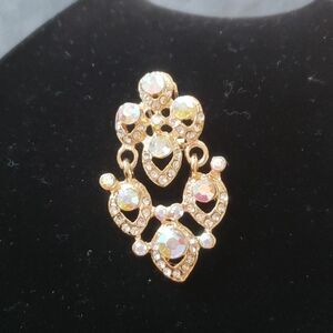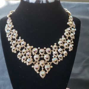 New in box earrings (for pierced ears), bracelet, adjustable ring and statement necklace gold tone with Aurora Borealis Crystals. This set is beautiful will make any dress perfect for events such as proms, weddings, winter formals, mardi gras balls or just a special night out wear them all or just one piece at a time. These crystals pull pink, blue, & green on thier own but do pull what you wear.