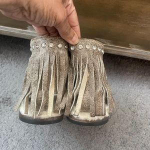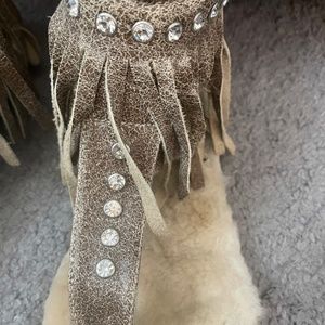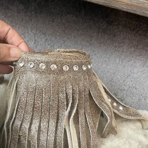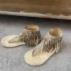 Super cute Leather Shearling Thong Sandal with Fringes. Crystals adorn around the ankle and down the front of the thong.
