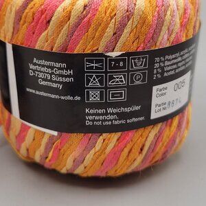 Austermann Sangria twisted cotton blend yarn. Yellow, orange and pink. Color 005, Lot #8674. 70% acrylic, 20% cotton, 8% rayon and 2% acetate. Made in Romania.