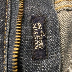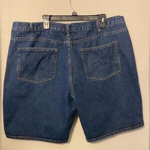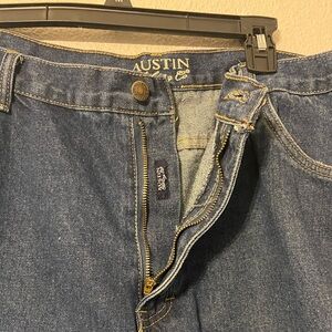 Classic denim jean shorts in a medium wash from Austin Clothing Co. Size 44 with a relaxed fit. A few spots show light-colored stitching, shown clearly in the photos. Great casual pair for everyday wear or yard work. *approximate measurements shown in photo provided as a courtesy. Measurements may vary due to positioning & not a guarantee of fit.* *stored and shipped from a smoke free - Dog friendly home* * Due to differences in lighting and screens, colors displayed on your device may vary from the actual fabric color. *All sales are final*