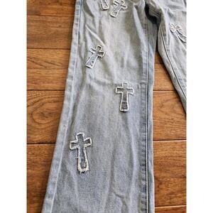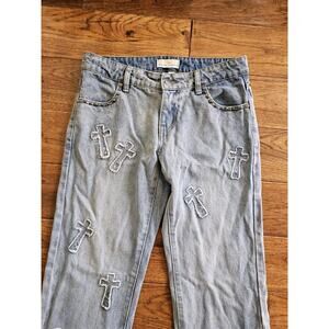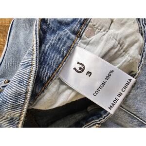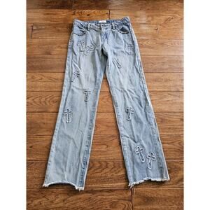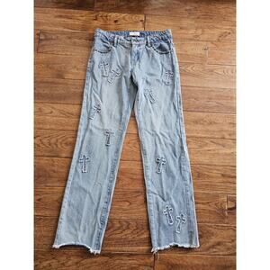 Beautiful distressed cross jeans in excellent condition and come from a clean and smoke-free home. Women's size 3 with a raw hem bottom. Please see measurements in the photos.