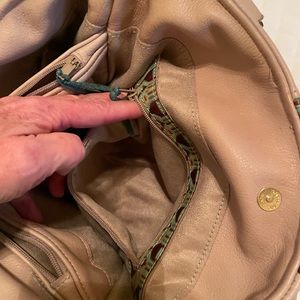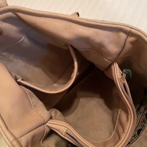 Western flare with turquoise embellished flap and embossed turquoise strip on front. NOTE: photos showing slight stain on lower back as well as discoloration when handles attach. No tears or stains inside. Lots of storage and zipper pouches. 13.5” x13.5” shoulder strap 12”