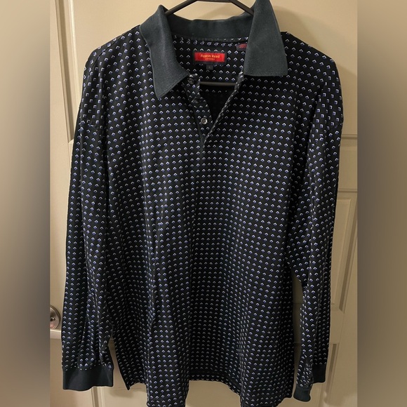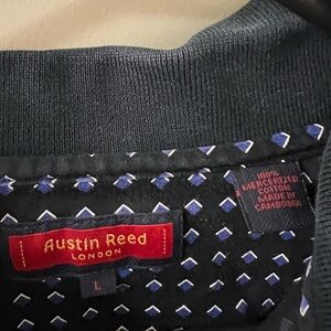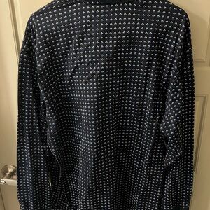 Stylish men's shirt featuring a black and white pattern. Perfect for any occasion. Size Large in good condition. D6