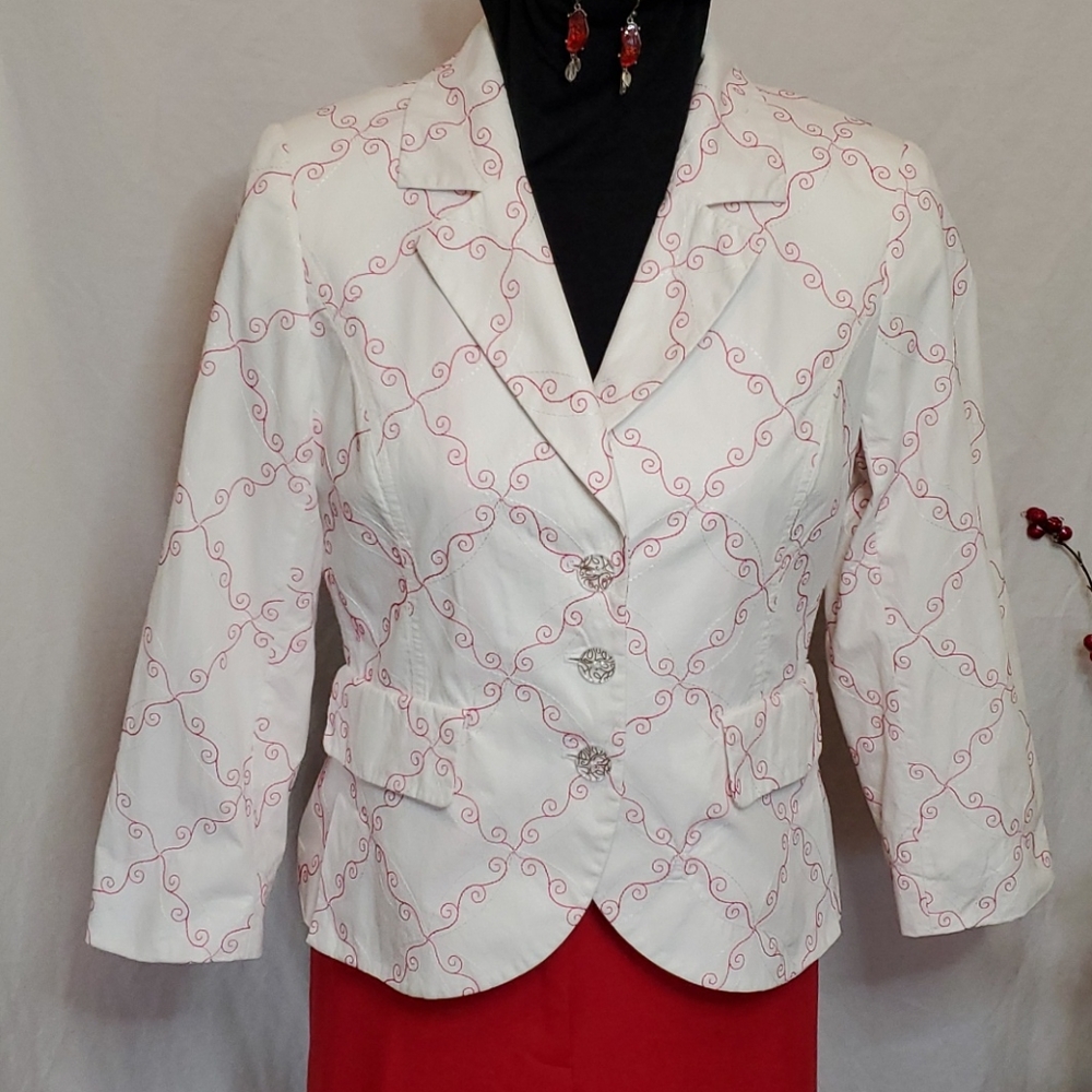 Adorable blazer, in excellent condition, 1 of my favorites but it is too small now. 100% cotton, fully lined and impeccably made. Red & white stitching, buttons have silver designs with extra button included. No imperfections, cleaned and steamed, ready to wear for spring💐