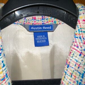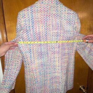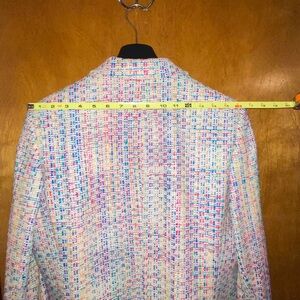 Stylish tweed blazer with vibrant colors. Ideal for adding flair to your wardrobe.100% Silk pearl buttons