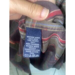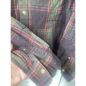 Tan olive green red yellow and blue plaid. 100% 2 ply cotton fabric. Long sleeves. Button down. Classic cut.