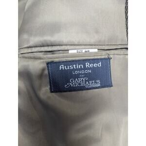 This is a vintage Austin Reed London blazer in size 44R, made from 100% lambswool with a full lining of 52% polyester and 48% viscose. It features a neutral brown and grey micro-herringbone weave, notch lapels, a two-button front closure, three exterior pockets, and a double-vented back. The piece is ideal for business, formal occasions, or vintage-themed events. Its classic structure and refined fabric give it a timeless appeal, well suited to minimalist or retro wardrobes. The soft lambswool construction offers comfort and warmth while maintaining a professional appearance.
