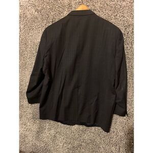 Elevate your formal wardrobe with this sophisticated Austin Reed Crafted from luxurious virgin wool, this gray striped ensemble offers a classic fit that exudes timeless elegance. The single-breasted jacket features a two-button front and notch lapels, complemented by four-button sleeves and practical inner pockets. Perfect for fall occasions, this blazer promises to keep you looking sharp and polished. The polyester lining ensures comfort, while the regular length and size 54R fit provide a tailored appearance. Dry clean only. Pre-owned, in excellent condition.