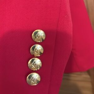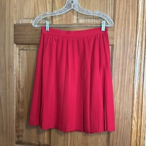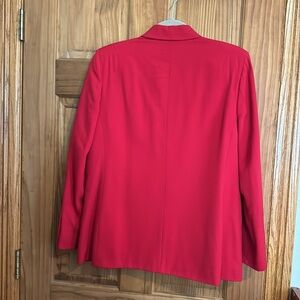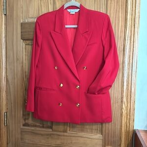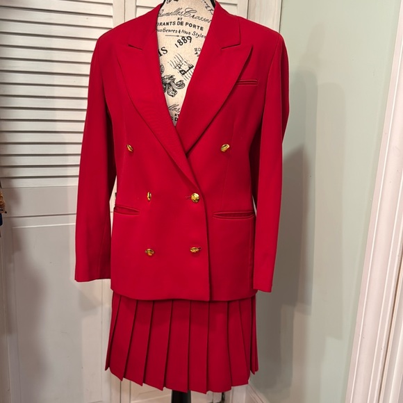 Beautiful Cardinal Red suit, made by Austin Reed. Petite sized.Made in USA of worsted wool. Has jacket and pleated skirt which falls at the knee. Both jacket and skirt completely lined. Beautiful gold plate buttons compliment the blazer.