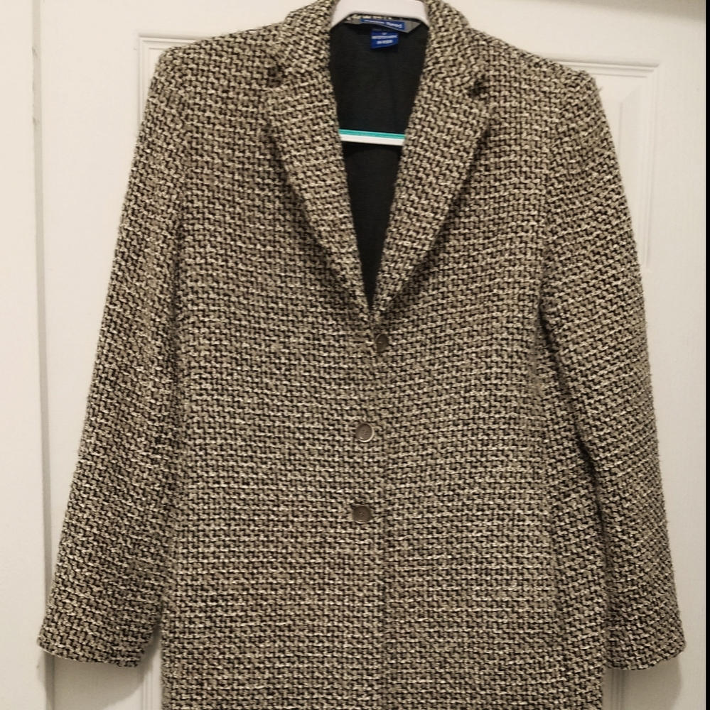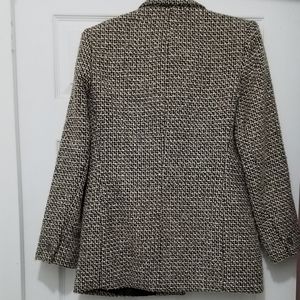 Nice single breasted blazer in good used condition with just some minor pulls as pictured. A wool mix, black and tan tweed. Great fall jacket.