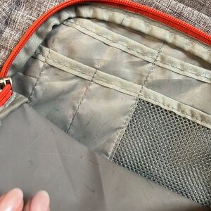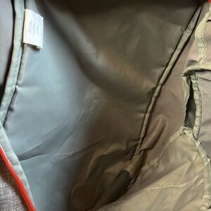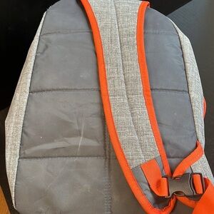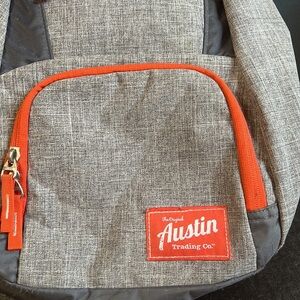 Function and cute. Austin Trading Co. crossbody backpack in orange and gray. In good used condition, some signs of wear as seen in pictures. Small front pocket has some markings inside, large exterior pocket clean. Note some small spots of discoloration on strap—could potentially be removed. Strap in good condition.
