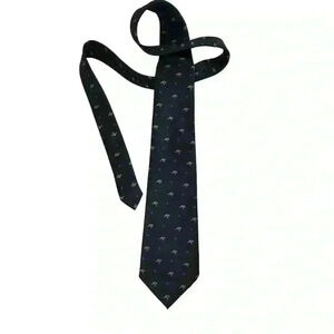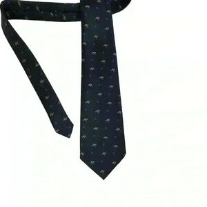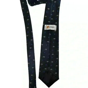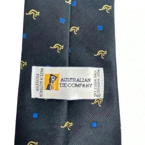 The Australian Tie Company offers a men's black tie featuring a geometric pattern with an animal theme. Made from polyester, this tie is manufactured in Australia and is not vintage or handmade. It comes in one size and is not personalized. The tie is pre-owned. Keywords: Australian Tie Company, men's tie, black tie, geometric pattern, animal theme, polyester tie, Australia, pre-owned tie, men's fashion, formal wear.