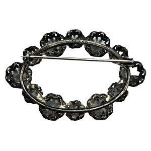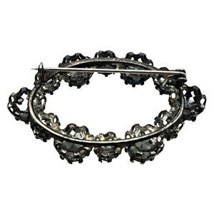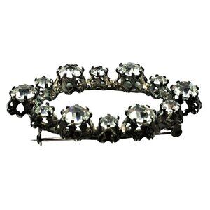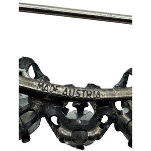 Signed "Made Austria" this clear rhinestone brooch has a darker setting and all rhinestones are prong set. It measures 1 7/8" x 1 1/4" and has an old "C" clasp closure.