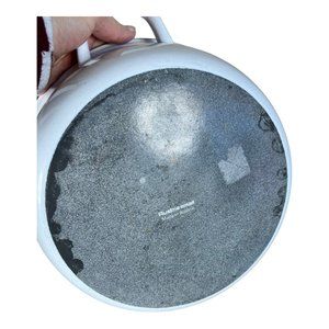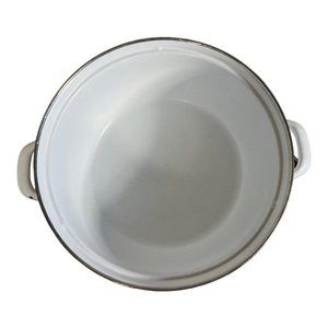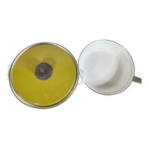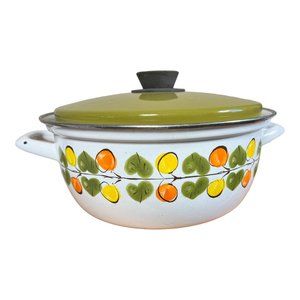 This kettle set includes a stock pot and a skillet with one lid that fits both kettles. Funky mid-century design on the outside. No nicks or scratches on the inside. The larger pot has one mark on the outside, see photo.