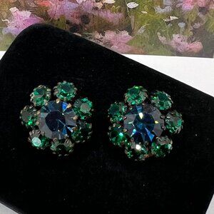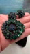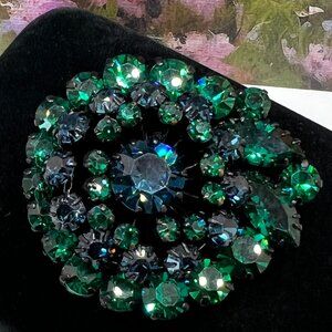 Domed Brooch with Navy Blue and Emerald Green Austria Crystals.