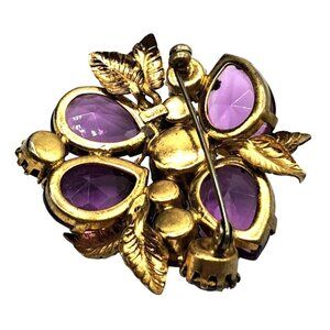 This signed Austria brooch features purple pear cut stones that actually feel like lucite to me and hot pink and purple rhinestone chatons, all prong set in gold tone metal with leaves on the front. This brooch measures 1 7/8" by 1 3/4." Please note that the center stone has one prong that is bent back and I am not able to put it back in place easily so am leaving it as is.