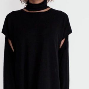 Finest Merino wool with open side seams. The collar and wide sleeves are only attached to the back of the pullover, meaning that this pullover becomes a top with stylishly attached sleeves.