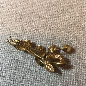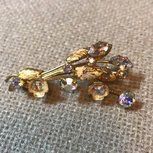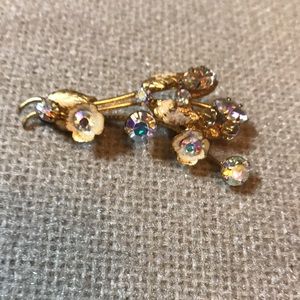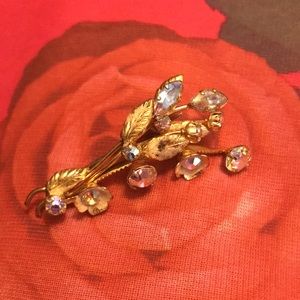 This is a Stunning and adorable Austrian pin depicting a snowed flowers bouquet with iridescent rhinestones, nicely set on a shiny gold tone metal.