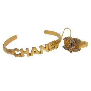 Auth CHANEL CC Logos Rhinestone Bangle Chain Ring #6 Gold-Tone 01C Vintage