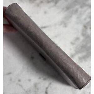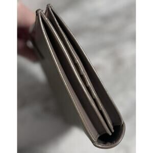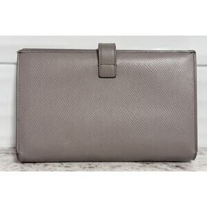 Auth. Celine jumbo calfskin strap bifold wallet. Color is like a gray taupe mix. Measures 7.5 inches wide by 5 inches tall. Pre-loved. Please note some minor signs of use. Minimal rubbing to corners. See photos. Minor signs of use on interior. Pockets are clean. Exterior snap & interior zipper works well. Comes with standard dust bag. Overall very good condition with normal signs of light use. (#142A)
