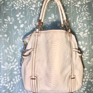 Python-embossed leather w| rose gold hardware, dog leash clip, pink lining, inside pockets, handles 6" drop, shoulder strap 18" drop.