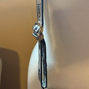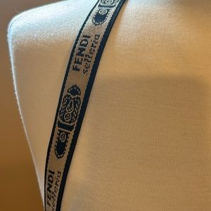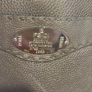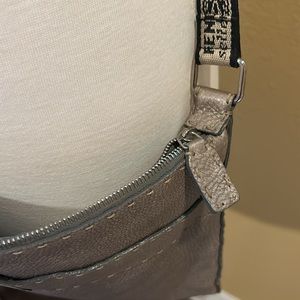 The Fendi crossbody bag features pebble grain leather body in a a kinda grey/tan (mane titanium) color , an adjustable flat nylon Fendi branded strap, a zip closure, a large exterior slip pocket, and an interior zip pocket.