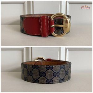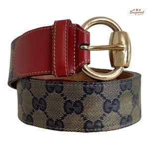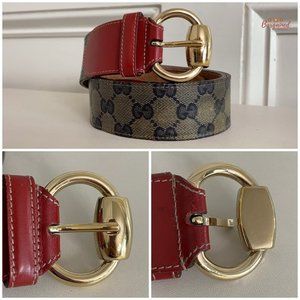 Auth GUCCI Beige/Blue/Red GG Crystal Coated Canvas Horsebit Buckle Belt 85/34