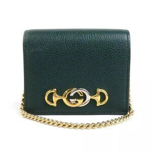 Auth GUCCI Bifold Wallet Chain Wallet Dark Green/Gold/Silver Leather - e59961a