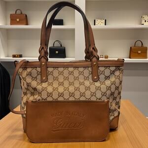Auth GUCCI Brown GG Canvas Craft and Leather Tote Bag