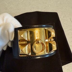 Auth Hermes Collier de Chien Bracelet, Black Leather, Yellow GP, Size T2