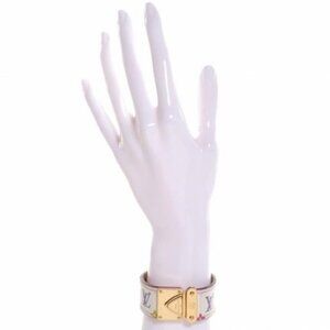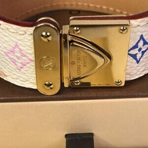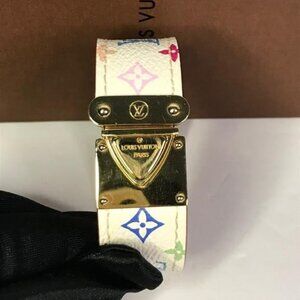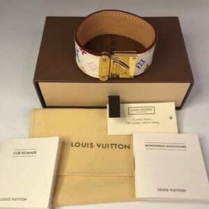 💯 Authentic LOUIS VUITTON Monogram Multicolor Koala Bracelet This is an Authentic multicolor Koala Bracelet by Louis Vuitton in white. It is made of multicolor monogram leather. It has a gold buckle with the LV signature. Authentic Louis Vuitton Murakami Monogram Multicolore White Canvas Gold Tone Metal Bracelet LOUIS VUITTON Monogram Multicolor Koala Bracelet M White No big call out Length 8 in Cir: 8.5 in Height 1 in Wear 2x This is an authentic LOUIS VUITTON Multicolor Koala Bracelet Small in White. This stylish cuff bracelet is composed of natural vachetta leather backing on a white toile monogram canvas in 33 brilliant colors. The bracelet secures with a brass presslock commonly found on the multicolor handbag line. This is a versatile accessory by Louis Vuitton!