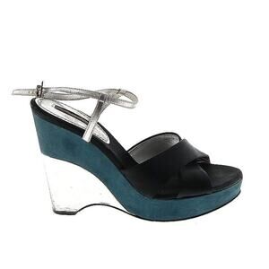 Auth Louis Vuitton Black Satin Silver Leather Teal Suede Wedge Heels EU 38 US 8
