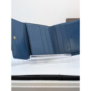 Elegant Louis Vuitton Epi Leather Compact Wallet in Blue. The item is absolutely giftable. Excellent condition with original box and 3rd party Dust Bag. There are a few small barely noticeable pen marks by the inner snap. There is also just a bit of rubbing inside the coin pouch ( might be fixable prior to shipping). No cracking or peeling in the bill compartments. (all original)