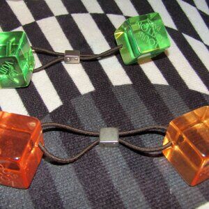 This is an authentic, rare Louis Vuitton inclusion resin cube hair tie in neon green & neon orange colored, comes with Louis Vuitton Bag, for women. This is a great collector's piece for any Louis Vuitton lover. These gorgeous Louis Vuitton hair ties are lightly used and well taken care of, almost new condition. These Louis Vuitton hair ties, hard to find, and rare.