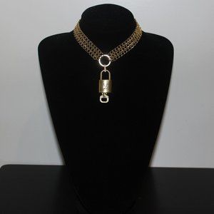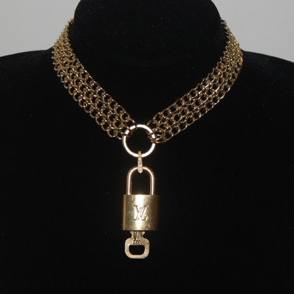 A thick style gold tone choker chain with a classic Louis Vuitton lock and key in this stunning piece! Gold rhinestoned bail makes adds the perfect sparkle touch. Stays securely closed with a lobster clasp. Each lock and key set is 100% authentic Louis Vuitton and serial numbered.