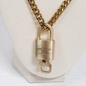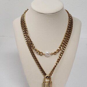 Auth Louis Vuitton Lock&Key Gold w/Unbranded Cuban Style Stainless Double Chain
