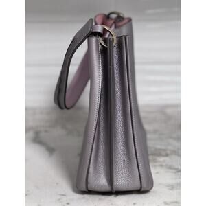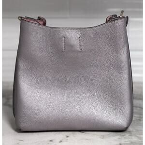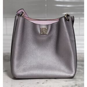 Auth MCM metallic grey silver leather Milla hobo shoulder bag. Measures 9 inches tall by 10.5 inches wide by 4.5 inches deep. Pre-loved. Pink suede interior. Please note some normal signs of light use. Small spot near one bottom foot. See photos. Cracking to leather accent on top of handle from use. See photos. Design flaw as a lot of the Milla hobo bags have this occurring from use. A few small pen marks near bottom interior of bag. Exterior hardware is in really good condition. No other flaws noted. Overall well cared for with normal signs of light use. Comes with standard dust bag. (#135A)