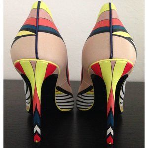 The listing includes the original Pucci box and dustbags that are shown in the pictures. This "Onyx" print pattern is curved stripes and swirls, like onyx or alabaster rock, in shades of tan, neon yellow, sun yellow, black, white, orange, red and dark teal with the little "Emilio Pucci" signatures. Uppers and soles are leather and the pattern matches exactly in the back seams on the heels, as well as each shoe being a mirror image of the other!