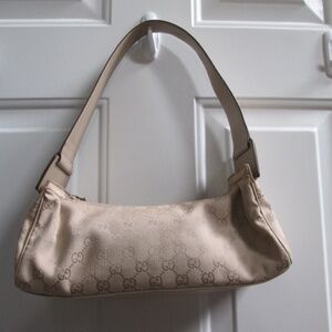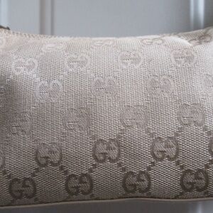 RARE Authentic NEW Vintage Gucci East West Beige shoulder bag in monogram embroidered canvas iconic logo pattern.