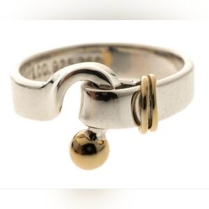 This ring from Tiffany & Co. comes lovingly crafted from silver, enhanced with yellow gold and designed to look like it's linked via a hook. It is complete with the brand initials engraved on the inside of the band. made of 925 sterling silver and 18k gold. In perfect pre loved condition, no defects what so ever. Size 5. I do not have the original Tiffany pouch to come with it.