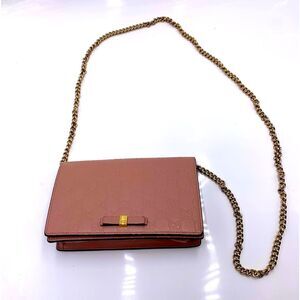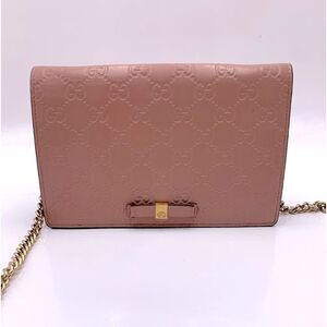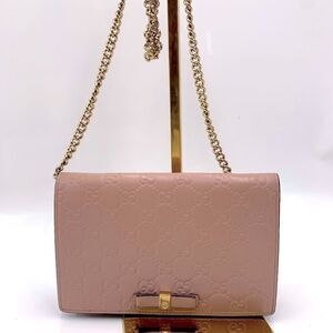 Auth Gucci Wallet On Chain Pink Beige Bow Guccisima Leather Gold Chain Strap Ex+