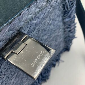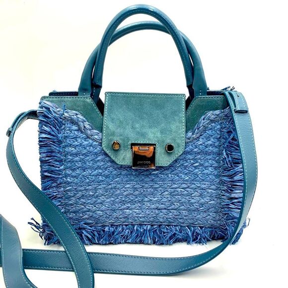 Auth Jimmy Choo Rebel Tote Raffia Suede Blue Dusk Front Clasp Handbag Preloved